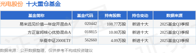 持有光电股份最多的基金为易米远见价值一年定开混合A,目前规模为2.88亿元,最新净值1.3071(10月24日),较上一交易日上涨6.23%,近一年上涨42.51%。该基金现任基金经理为孙会东 魏鑫。