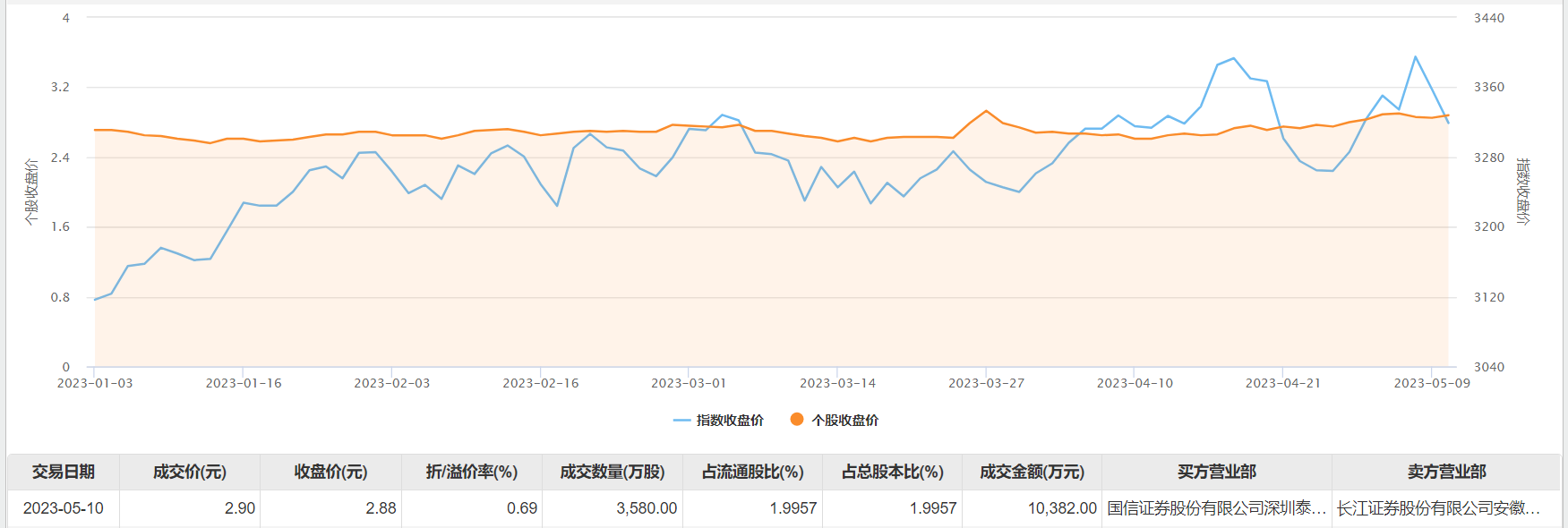 5月10日大宗交易成交3580万股,成交额1.04亿元,占当日总成交额的46.47%,成交价2.9元,较市场收盘价2.88元溢价0.69%。