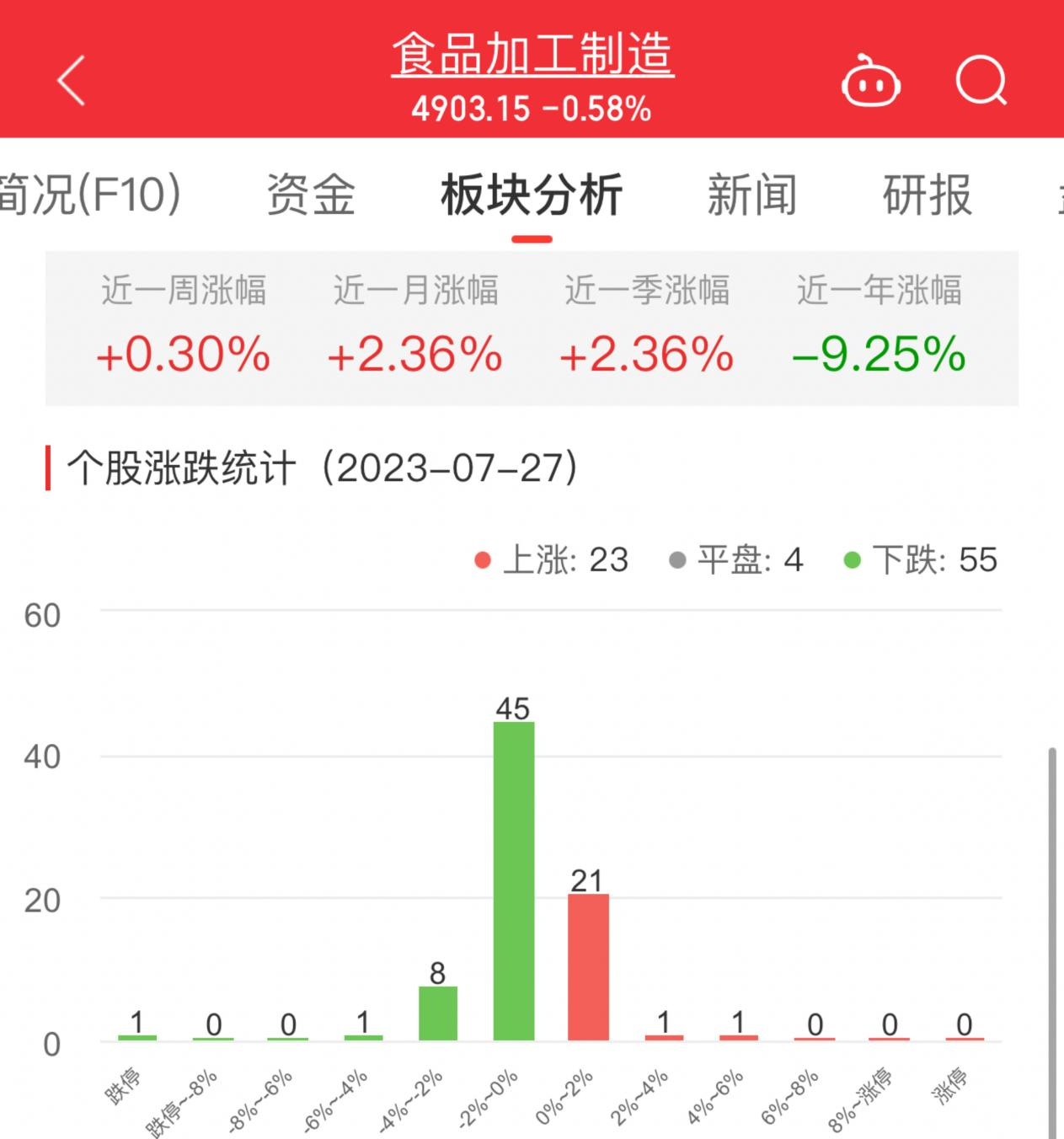 中国经济网北京7月27日讯 今日,食品加工制造板块整体跌幅0.58%,其中,23只股票上涨,4只股票平盘,55只股票下跌。