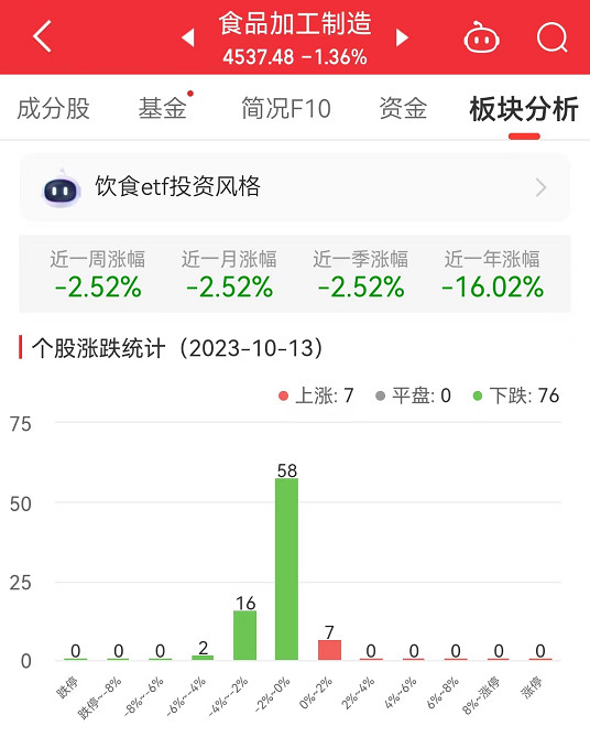 中国经济网北京10月13日讯 今日,食品加工制造板块整体跌幅1.36%,其中,7只股票上涨,0只股票平盘,76只股票下跌。