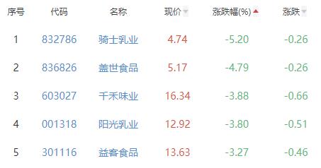 骑士乳业、盖世食品、千禾味业、阳光乳业、益客食品位列涨幅榜后五位,涨幅分别为-5.20%、-4.79%、-3.88%、-3.80%、-3.27%。