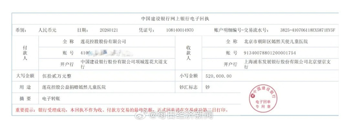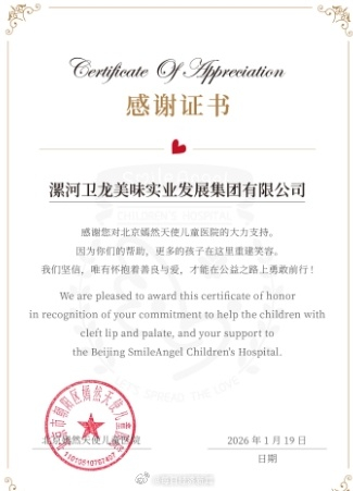 【#莲花味精母公司向嫣然医院捐52万#】#莲花卫龙巴奴等河南企业出手捐款# 1月21日,莲花味精母公司莲花控股微信公号发文称,向面临运营困境的北京市朝阳区嫣然天使儿童医院定向捐赠善款52万元。该笔善款将专项用于唇腭裂儿童的医疗救助与康复支持工作,以帮助更多贫困家庭儿童获得专业诊疗服务。
