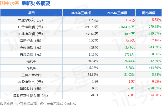 据证券之星公开数据整理,近期国中水务(600187)发布2025年三季报。截至本报告期末,公司营业总收入1.32亿元,同比上升5.53%,归母净利润-1614.02万元,同比下降279.38%。按单季度数据看,第三季度营业总收入5534.79万元,同比上升38.54%,第三季度归母净利润217.75万元,同比下降42.97%。本报告期国中水务公司应收账款体量较大,当期应收账款占最新年报归母净利润比达568.57%。