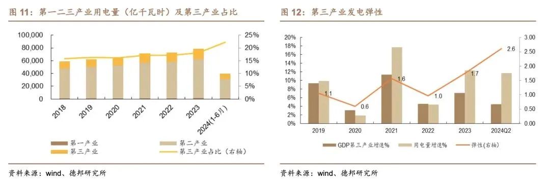 其中第三产业,随着GDP增长,带动电力消费弹性指数上升到2.61,远超2023年消费弹性指数的1.74。在经济复苏大背景下,第三产业将持续拉动社会用电需求提升。