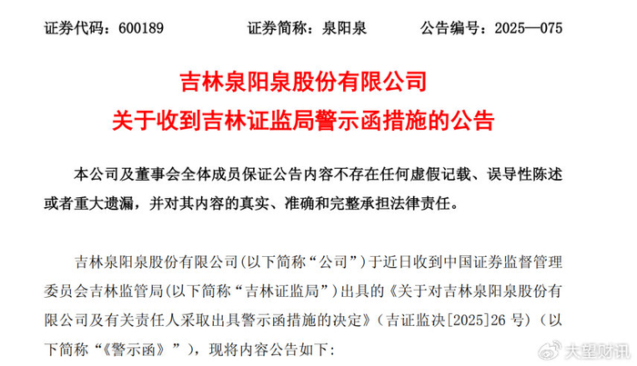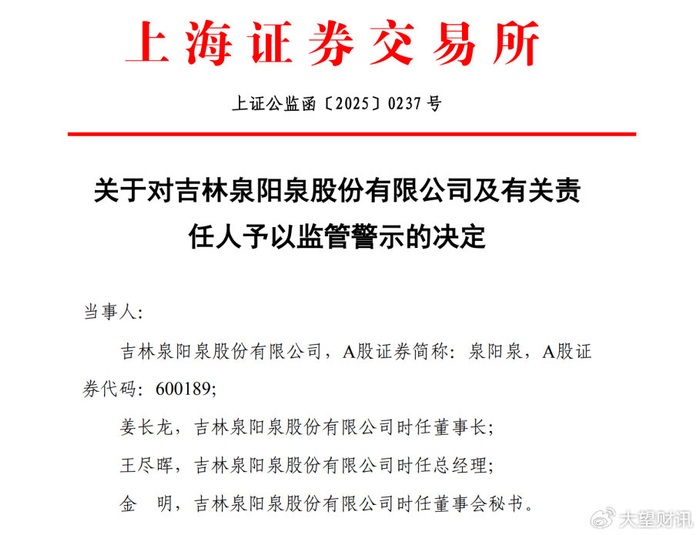 近日,资本市场监管罚单密集落地,吉林泉阳泉股份有限公司(以下简称“泉阳泉”)同时收到上海证券交易所监管警示及吉林证监局行政监管措施决定书。