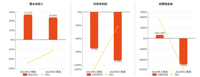 公司营业总收入为10.95亿元,在已披露的同业公司中排名第83,较去年同报告期营业总收入减少1.42亿元,同比较去年同期下降11.46%。归母净利润为-1.59亿元,在已披露的同业公司中排名第135,较去年同报告期归母净利润减少3931.75万元。经营活动现金净流入为-1.06亿元,在已披露的同业公司中排名第109,较去年同报告期经营活动现金净流入减少1.20亿元,同比较去年同期下降866.11%。