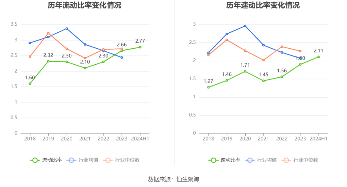 2024年上半年,公司流动比率为2.77,速动比率为2.11。