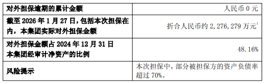 中国经济网北京1月28日讯 复星医药(600196.SH)昨晚发布关于为控股子公司提供担保的进展公告。截至2026年1月27日,包括本次担保在内,集团实际对外担保金额折合人民币约2,276,279万元,约占2024年12月31日本集团经审计的归属于上市公司股东净资产的48.16%;均为公司与控股子公司/单位之间、控股子公司/单位之间发生的担保。截至2026年1月27日,集团无逾期担保事项。