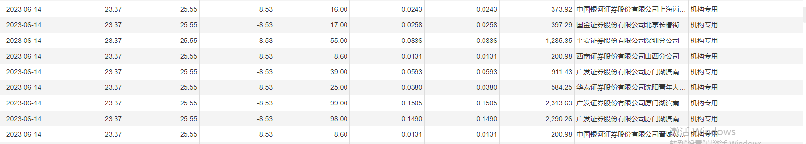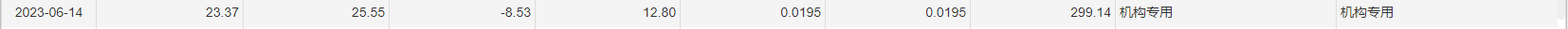 6月14日大宗交易成交634.8万股,成交额1.48亿元,占当日总成交额的20.1%,成交价23.37元,较市场收盘价25.55元折价8.53%。