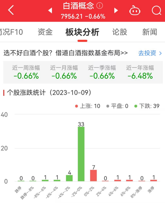 中国经济网北京10月9日讯今日,白酒概念板块整体跌幅0.66%,其中10只股票上涨,0只股票平盘,39只股票下跌。