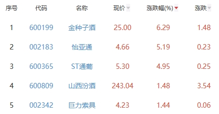 其中,金种子酒、怡亚通、ST通葡、山西汾酒、巨力索具位列板块涨幅前五位,涨幅分别为6.29%、5.19%、4.95%、1.48%、1.44%。