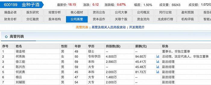 东方财富网信息显示,金种子酒目前总经理仍为何秀侠,专科学历,年薪约95万。