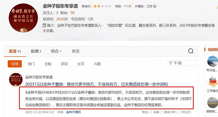 (来源:东方财富网股吧)“金种子股东专享酒”还补充道,“贾总6月份就兼职金种子集团总经理了,半年前的老新闻了。公司证券部打算起诉造谣华润退出金种子酒的人,谁有聊天记录和他身份信息的证据,欢迎提交”。
