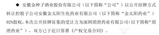 此外,金种子酒近日发布公告披露,公司通过公开挂牌方式转让持有的金太阳药业92%的股权,该股权最终由深圳珺澄药业有限公司以1.26亿元摘牌受让。而此前首次挂牌价格定为1.4亿元,但因未能征集到符合条件的有效意向受让方而导致流标,为推进交易落地,金种子酒以首次挂牌价的90%确定二次挂牌底价,并由珺澄药业成功摘牌。