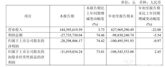 财报数据显示,金种子酒前三季度营业收入为6.28亿元,同比下降22.08%,归母净利润为-1.00亿元,亏损同比扩大0.97%,营利均有所下降。而在第三季度公司实现营业收入1.44亿元,同比增长3.73%,归母净利润为-2829.88万元,同比收窄74.42%,但仍为亏损状态。