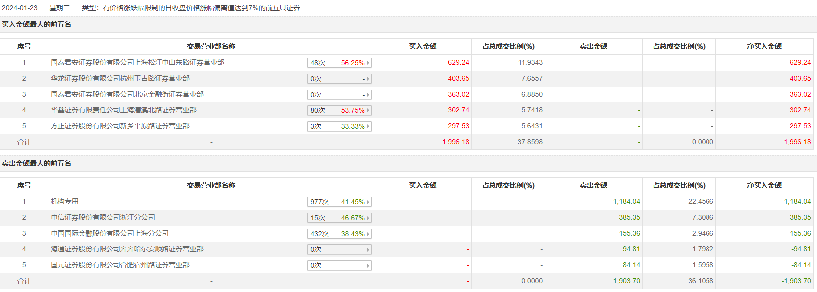 1月23日,江苏吴中今日涨停,全天换手率达0.83%,振幅达0%。龙虎榜数据显示,营业部席位合计净买入92.48万元。其中,机构合计净卖出1184.04万元。此外,国泰君安证券上海松江中山东路证券营业部、华龙证券杭州玉古路证券营业部分别买入629.24万元、403.65万元;中信证券浙江分公司、中国国际金融上海分公司分别卖出385.35万元、155.36万元。