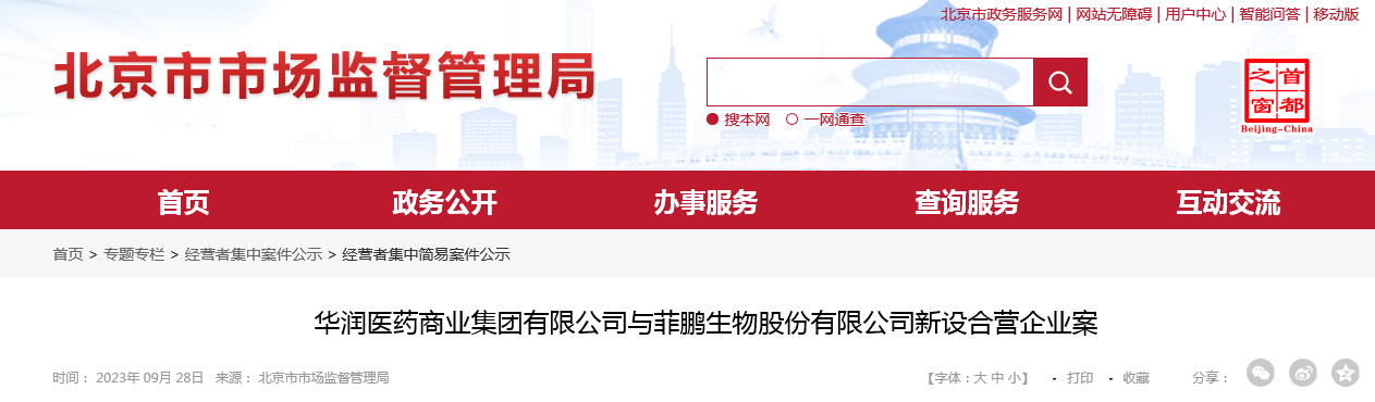 华润医药商业集团有限公司与菲鹏生物股份有限公司新设合营企业案