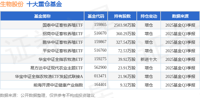 持有生物股份最多的基金为国泰中证畜牧养殖ETF,目前规模为60.97亿元,最新净值0.6436(10月28日),较上一交易日下跌0.94%,近一年上涨12.48%。该基金现任基金经理为梁杏。