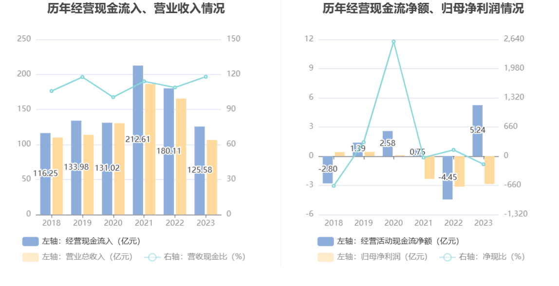 2023年,公司营业收入现金比为118.01%,净现比为-182.88%。