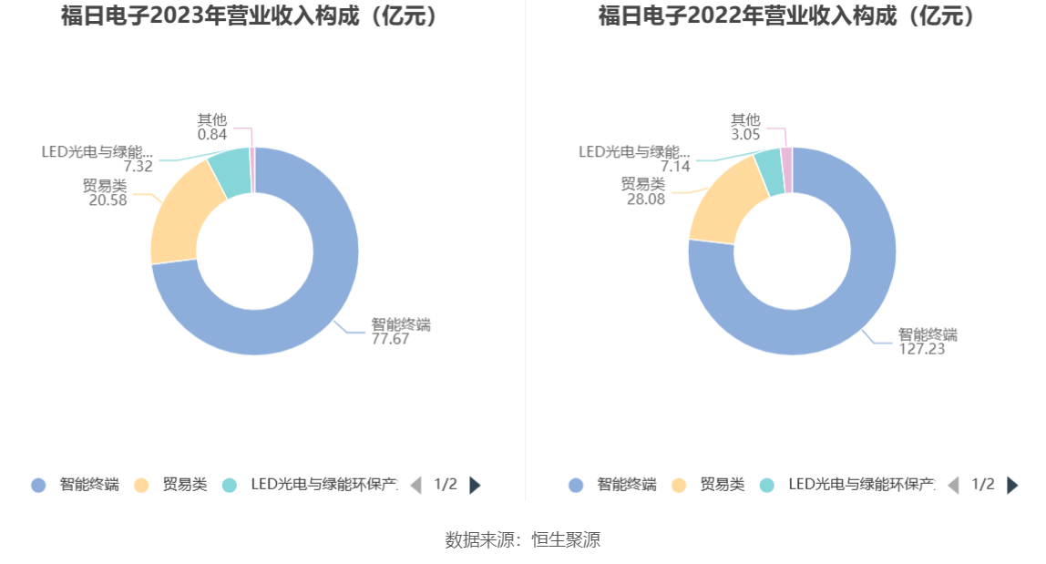 分产品看,智能终端、贸易类、LED光电与绿能环保产业2023年毛利率分别为8.06%、2.23%、17.89%。