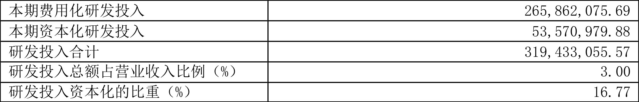 2023年全年,公司研发投入金额为3.19亿元,同比下降1.34%;研发投入占营业收入比例为3.00%,相比上年同期上升1.04个百分点。此外,公司全年研发投入资本化率为16.77%。
