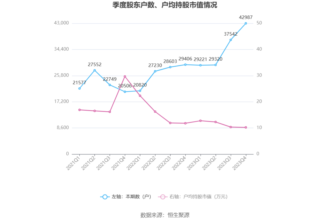 筹码集中度方面,截至2023年年末,公司股东总户数为4.3万户,较三季度末增长了5445户,增幅14.50%;户均持股市值由三季度末的10.35万元下降至10.22万元,降幅为1.26%。