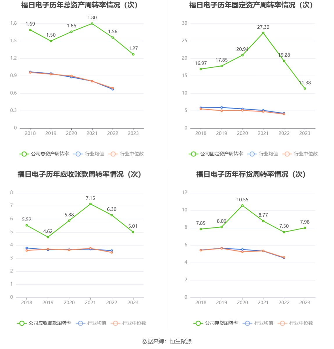 营运能力方面,2023年,公司公司总资产周转率为1.27次,上年同期为1.56次(2022年行业平均值为0.67次,公司位居同行业7/94);固定资产周转率为11.38次,上年同期为19.28次(2022年行业平均值为4.28次,公司位居同行业7/94);公司应收账款周转率、存货周转率分别为5.01次、7.98次。