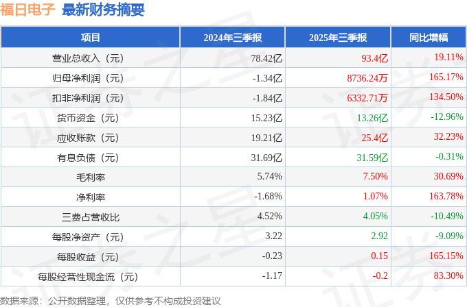 据证券之星公开数据整理,近期福日电子(600203)发布2025年三季报。截至本报告期末,公司营业总收入93.4亿元,同比上升19.11%,归母净利润8736.24万元,同比上升165.17%。按单季度数据看,第三季度营业总收入40.08亿元,同比上升58.33%,第三季度归母净利润6527.8万元,同比上升260.97%。本报告期福日电子盈利能力上升,毛利率同比增幅30.22%,净利率同比增幅163.78%。