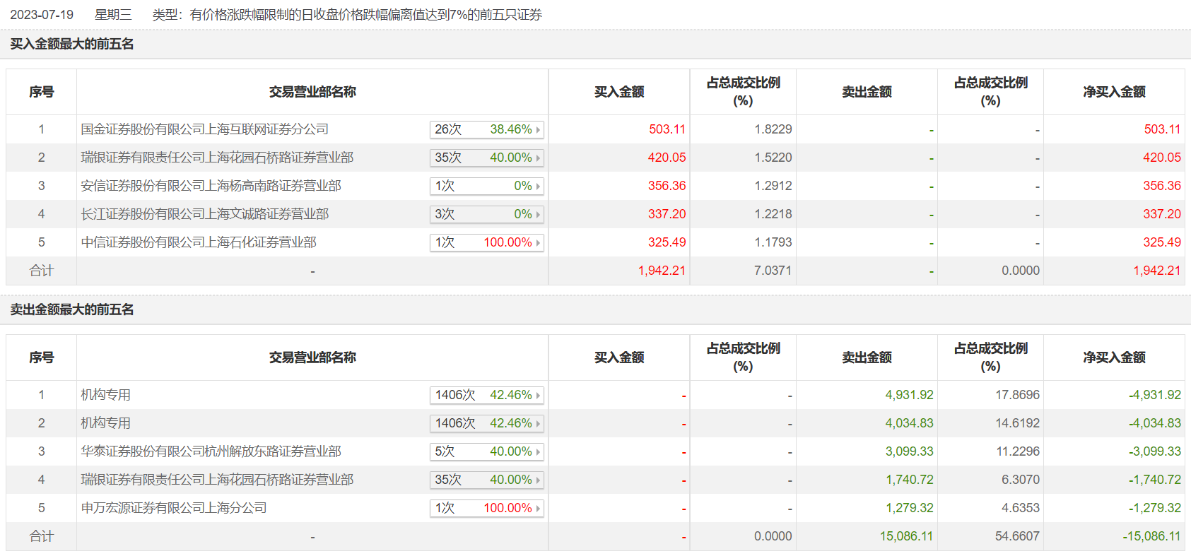 具体来看,机构合计净卖出8966.75万元。此外,华泰证券杭州解放东路证券营业部、瑞银证券上海花园石桥路证券营业部分别卖出3099.33万元、1740.72万元;国金证券上海互联网证券分公司、瑞银证券上海花园石桥路证券营业部分别买入503.11万元、420.05万元。