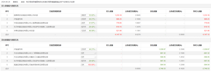 新湖中宝6月28日跌停,龙虎榜数据显示,上榜营业部席位全天成交7896.43万元,占当日总成交金额比例为17.19%。其中,买入金额为4147.1万元,卖出金额为3749.33万元,合计净买入397.77万元。