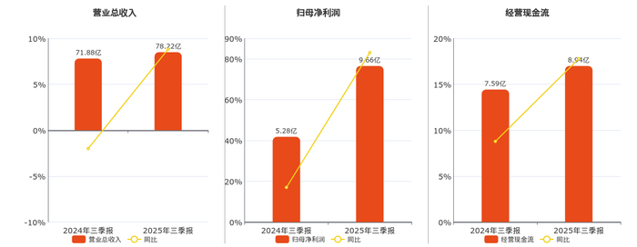 公司营业总收入为78.22亿元。归母净利润为9.66亿元。经营活动现金净流入为8.94亿元。