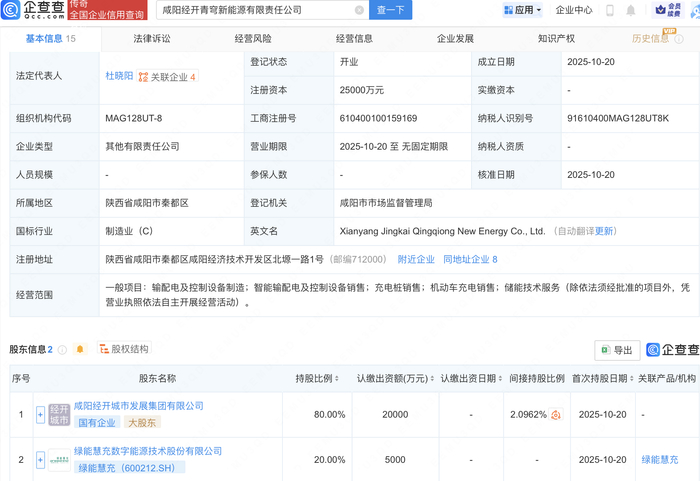 企查查APP显示,近日,咸阳经开青穹新能源有限责任公司成立,注册资本2.5亿元,经营范围包含:输配电及控制设备制造;智能输配电及控制设备销售;充电桩销售;机动车充电销售;储能技术服务。企查查股权穿透显示,该公司由绿能慧充(600212)等共同持股。
