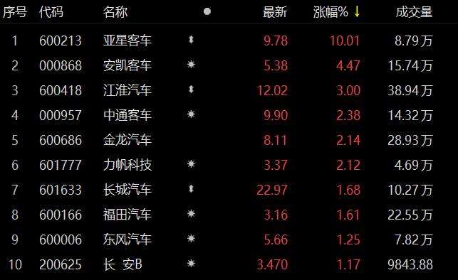 汽车整车板块异动拉升 亚星客车涨停