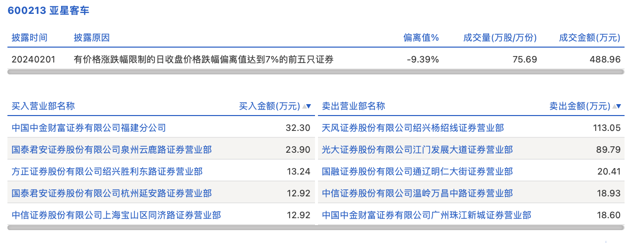 2月1日,亚星客车今日跌停,全天换手率达0.26%,振幅达0%。龙虎榜数据显示,营业部席位合计净卖出165.51万元。其中,天风证券绍兴杨绍线证券营业部、光大证券(维权)江门发展大道证券营业部分别卖出113.05万元、89.79万元;中国中金财富证券有限公司福建分公司、国泰君安证券泉州云鹿路证券营业部分别买入32.30万元、23.90万元。