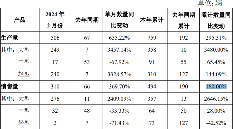3月6日公告,2024年2月销售总量310辆,同比增长369.7%;1-2月累计销售总量494辆,同比增长160%。