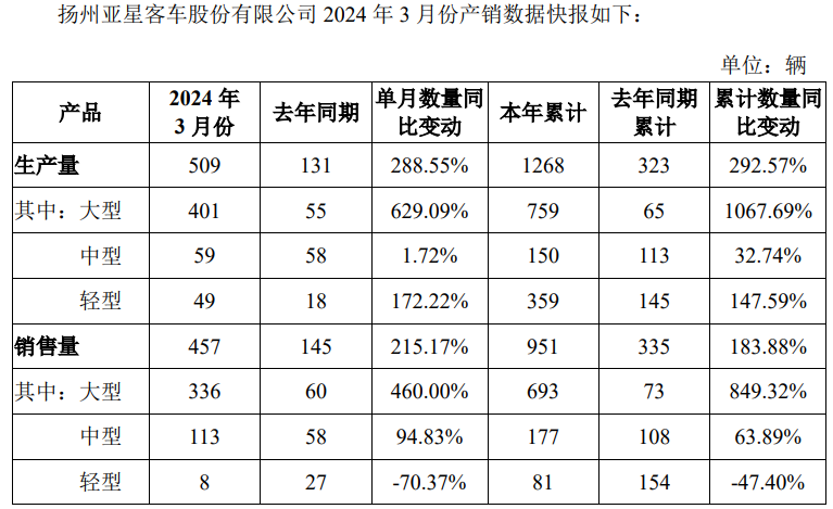 4月3日公告,3月份销量457辆,同比增长215.17%;1-3月份累计销量951辆,同比增长183.88%。