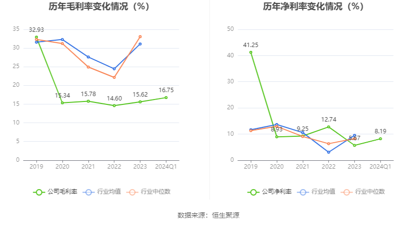 2024年第一季度,公司毛利率为16.75%,同比下降6.50个百分点;净利率为8.19%,较上年同期下降3.70个百分点。