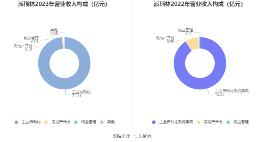 分产品来看,2023年公司主营业务中,工业自动化收入21.11亿元,占营业收入的98.77%;房地产开发收入0.16亿元,同比下降84.09%,占营业收入的0.73%;物业管理收入0.05亿元,同比下降53.08%,占营业收入的0.24%。