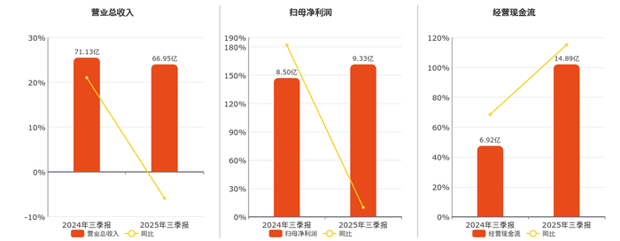 公司营业总收入为66.95亿元,较去年同报告期营业总收入减少4.18亿元,同比较去年同期下降5.87%。归母净利润为9.33亿元。经营活动现金净流入为14.89亿元。