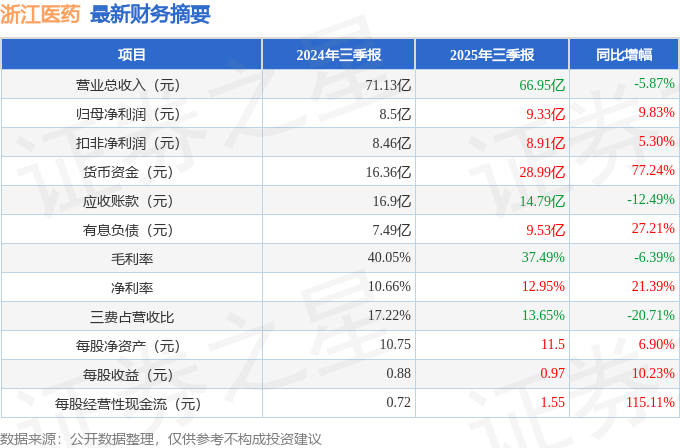 据证券之星公开数据整理,近期浙江医药(600216)发布2025年三季报。根据财报显示,浙江医药净利润同比增长9.83%。截至本报告期末,公司营业总收入66.95亿元,同比下降5.87%,归母净利润9.33亿元,同比上升9.83%。按单季度数据看,第三季度营业总收入23.72亿元,同比下降12.37%,第三季度归母净利润2.6亿元,同比下降51.37%。