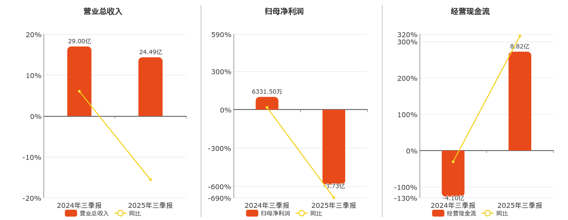 公司营业总收入为24.49亿元,在已披露的同业公司中排名第31,较去年同报告期营业总收入减少4.51亿元,同比较去年同期下降15.56%。归母净利润为-3.73亿元,在已披露的同业公司中排名第107,较去年同报告期归母净利润减少4.36亿元,同比较去年同期下降689.07%。经营活动现金净流入为8.82亿元,在已披露的同业公司中排名第14,较去年同报告期经营活动现金净流入增加12.92亿元。