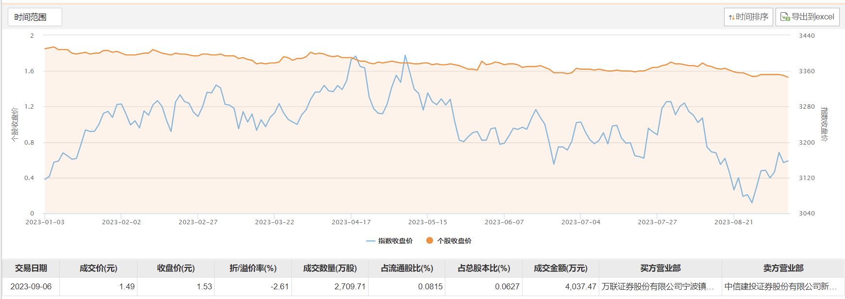 9月6日大宗交易成交2709.71万股,成交额4037.47万元,占当日总成交额的26.15%,成交价1.49元,较市场收盘价1.53元折价2.61%。