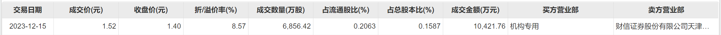 今日大宗交易成交6856.42万股,成交额1.04亿元,占当日总成交额的60.8%,成交价1.52元,较市场收盘价溢价8.57%。