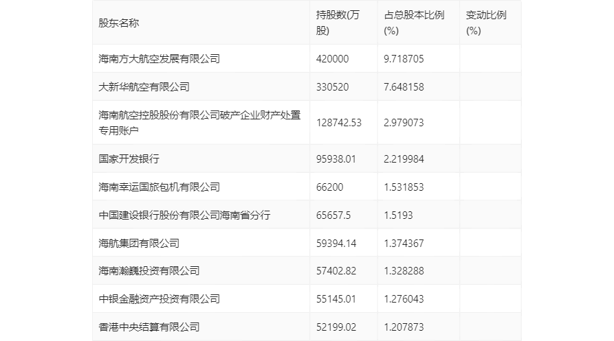 半年报显示,2024年上半年末公司十大流通股东中,新进股东为香港中央结算有限公司,取代了一季度末的海南海航商务服务有限公司。在具体持股比例上,海南航空控股股份有限公司破产企业财产处置专用账户持股有所下降。