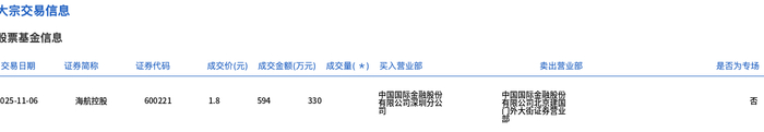 海航控股今日大宗交易平价成交330万股,成交额594万元