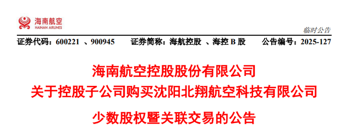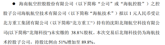 公告显示,海南航空控股股份有限公司当日召开第十一届董事会第二次会议,会议审议并通过《关于控股子公司购买沈阳北翔航空科技有限公司少数股权暨关联交易的议案》。公司董事会同意公司控股子公司海航航空技术有限公司以 1 元人民币受让北方重工集团有限公司持有的沈阳北翔航空科技有限公司未实缴的 38.8%股权。本次交易后北翔科技仍为海航技术控股子公司,持股比例由51%增加至 89.8%。