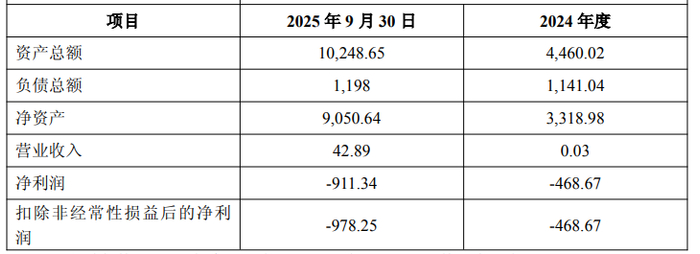 截至2025 年 9 月 30 日,北翔科技资产总额 10,248.65 万元,负债总额 1,198 万元,净资产 9,050.64 万元,营业收入 42.89 万元,净利润 - 911.34 万元,扣除非经常性损益后的净利润 - 978.25 万元。