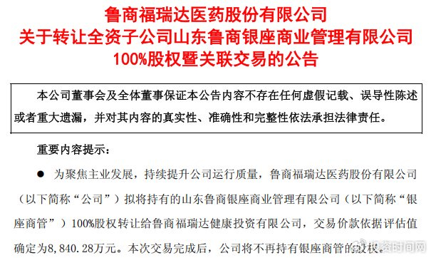 鲁商福瑞达医药股份有限公司(下称福瑞达,600223.SH)公告称,拟将持有的全资子公司山东鲁商银座商业管理有限公司(下称银座商管)100%股权,以8840.28万元转让给鲁商福瑞达健康投资有限公司(下称福瑞达健康投资)。本次交易完成后,福瑞达不再持有银座商管股权。