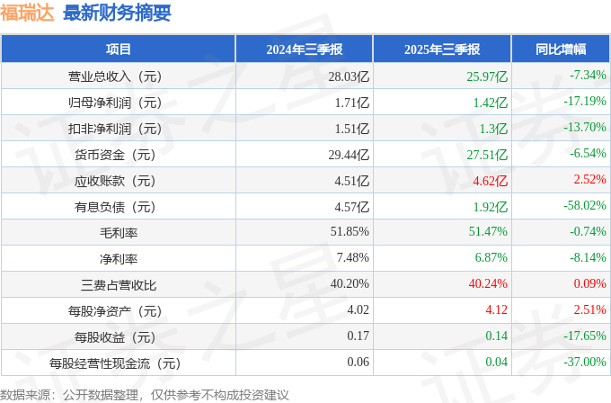 据证券之星公开数据整理,近期福瑞达(600223)发布2025年三季报。截至本报告期末,公司营业总收入25.97亿元,同比下降7.34%,归母净利润1.42亿元,同比下降17.19%。按单季度数据看,第三季度营业总收入8.07亿元,同比下降7.97%,第三季度归母净利润3378.08万元,同比下降23.07%。本报告期福瑞达公司应收账款体量较大,当期应收账款占最新年报归母净利润比达189.82%。