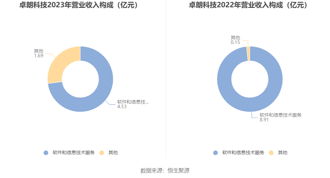 分产品来看,2023年公司主营业务中,软件和信息技术服务收入4.53亿元,同比下降49.13%,占营业收入的72.85%。